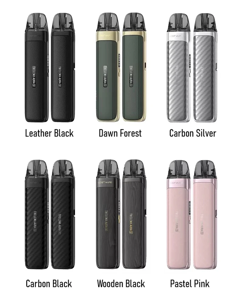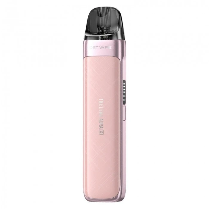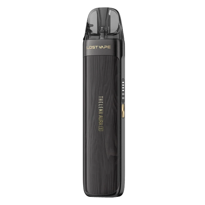 Lost Vape Thelema Aura S - zestaw typu pod z wbudowanym akumulatorem o pojemności 1600 mAh, ładowany przez USB-C. Moc wyjściowa regulowana automatycznie w zależności od oporności grzałki do 40W. Boczny suwak reguluje dolot powietrza. Niewielki wyświetlacz na boku urządzenia wskazuje poziom naładowania baterii. Aktywowany na zaciągnięcie. Kompatybilny z kartridżami z serii E-Plus, na wymienne grzałki UB Elite. Dzięki różnym opornościom można stosować zarówno sole nikotynowe, jak i liquidy oparte o bazę glicerynową.